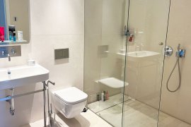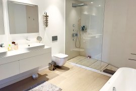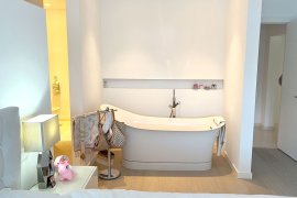 Das Apartment hat drei Schlafzimmer, wovon die zwei Hauptschlafräume jeweils über Doppelbetten, luxuriöse Parkettböden, sowie En-Suite-Badezimmer mit Badewanne und begehbarer Dusche verfügen. Das dritte Zimmer hat ebenfalls ein Doppelbett, könnte aber auch als möglicher Büroraum genutzt werden. Gegenüber liegt das Gästebadezimmer mit begehbarer Dusche und WC. Alle drei Badezimmer haben Fussbodenheizung.