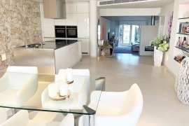 Der Wohnbereich unterteilt sich in drei offene Bereiche mit hohen Decken und exklusivem Natursteinboden: das Wohnzimmer mit großer Couch, die offene Einbauküche von Nolte mit Kochinsel und dem Essensbereich mit einem edlem Glastisch und sechs hochwertigen Ledersesseln.